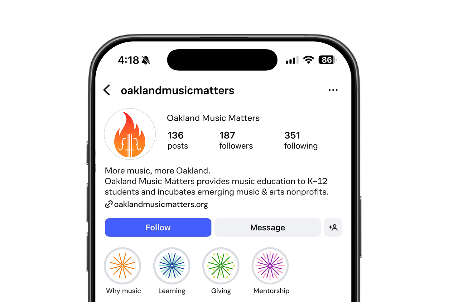 We created a visual identity for Oakland Music Matters as it begins a new chapter after taking over the Harmony Project Oakland program. Guided by the essence of energetic, empowering, and community-focused, we developed a clear, friendly, and cohesive system that engages students, families, funders, and the broader Oakland community across multiple platforms.